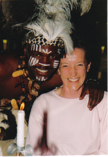 Helen makes a new friend during an evening of Zulu dancing on our trip to Tunisia. |