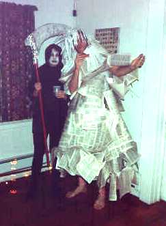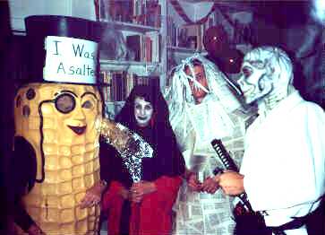 | That's LaVonne in the Planter's peanut costume. Her victimization angle was "I was a salted (nut)." Opposite on the far right is Tip, who came as a "Middle-Aged Mutant Ninja Human." The couple in between are "Death" and "Taxes" (a.k.a. Robin and Will Purves). | Ugh! Death and Taxes again! You just can't avoid them! |