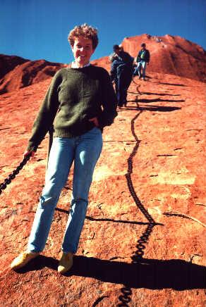 This is the famous Ayers Rock in Central Australia. It is remarkable in that it's a giant rock sticking up out of a vast flat plain. Steep to climb, many have lost their lives in attempting to summit. This giant sandstone is much photographed from the Four Seasons Hotel four miles away at sunset when it turns bright red. |