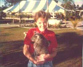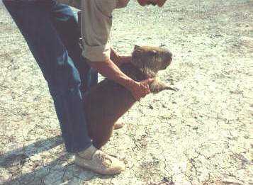 No, this is not a scene from a science fiction movie in which mutant hamsters threaten to take over the planet. This cute little fellow is a capybara, the world's largest rodent. They are abundant in Venezuela's Llanos flood plain region, though very hard to catch. We spent 5 minutes chasing this one in a truck until he was exhausted enough to be grabbed, and he only has 3 legs! |