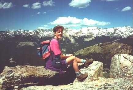 Helen stops to enjoy a spectacular view of the Never Summer Mountains from a spot we've dubbed "Marmot Rock" on one of our favorite hikes in Rocky Mountain National Park. |